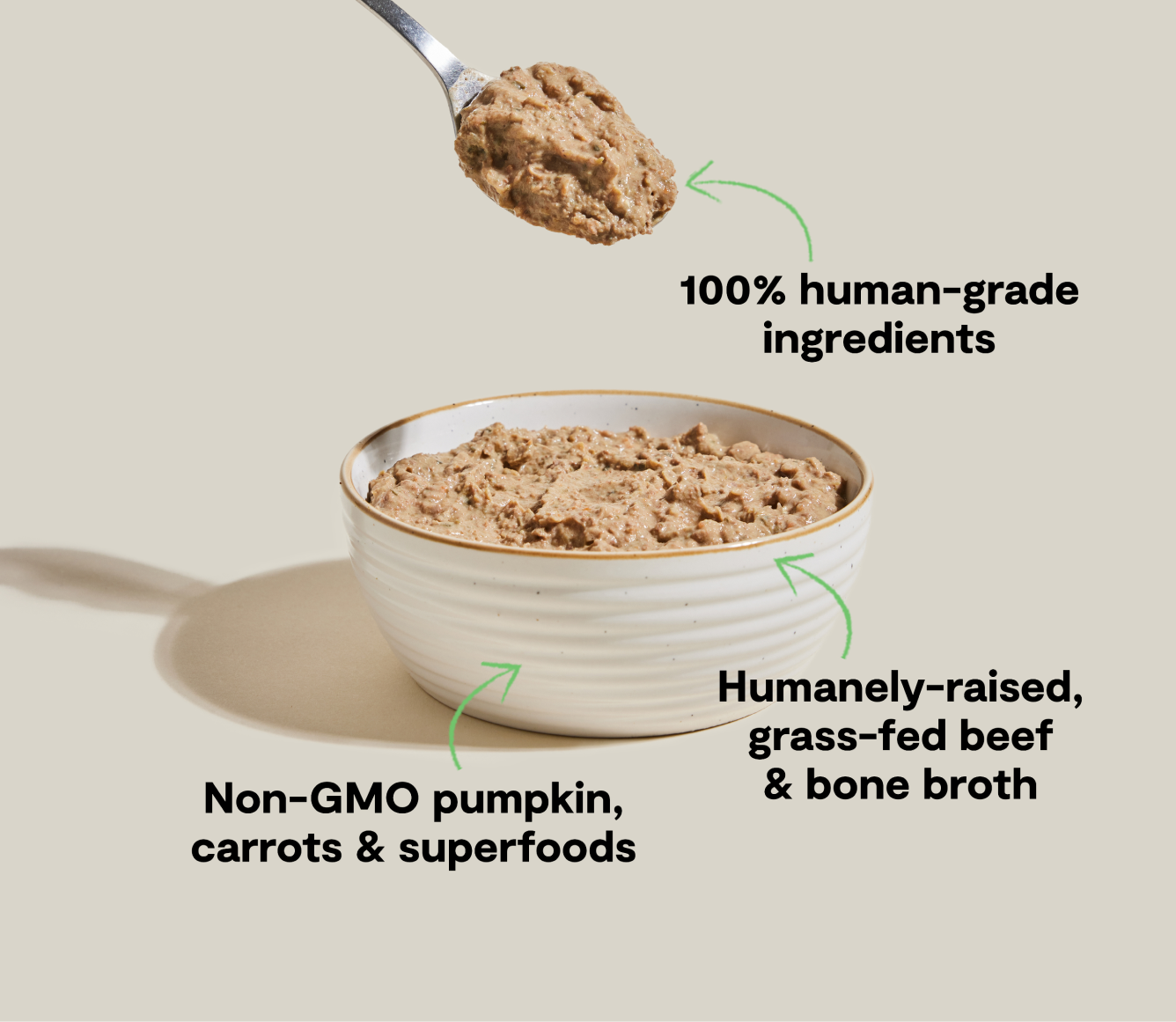 Boost their bowl with a savory blend of pasture-raised, grass fed beef, beef bone broth, and non-GMO veggies – all human-grade ingredients kettle-cooked to perfection. Mix this juicy rustic blend with your cat's meal or serve alone as a complete and balanced diet.